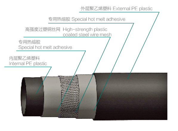 複合管是正逆方向螺旋纏繞在管材中分布的高強度鋼(gāng)絲為增強骨(gǔ)架,以高(gāo)密度聚乙烯為基本材料,利用高性能改(gǎi)性聚乙烯粘接樹脂,在生(shēng)產線上通過連續、分次擠塑複合成型。管(guǎn)道連接(jiē)采用電(diàn)熱熔連接,連接強度與管體本身一致。